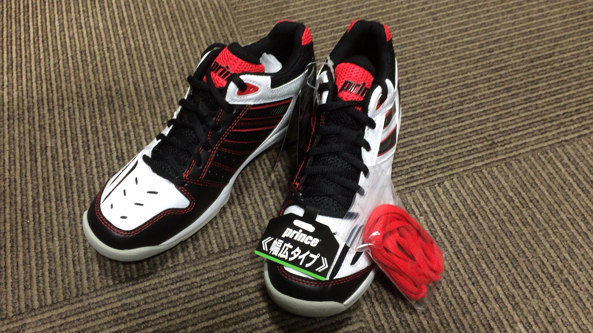 みなさんこんばんはフロントの高橋ですプリンスから、NEWシューズが届きましたAEROFIT GAME XI HCDPS521 ホワイト×ブラック×レッド定価12,000円⇒10,368円(税込)★長時間のプレーでも心地良い履き心地★ストップ・ダッシュ時における衝撃を和らげる★日本人の足型に合わせた幅広タイプこちらのシューズ、靴ひもを赤に付け替えられるんですぜひ、ロンドで試し履きしてみてください