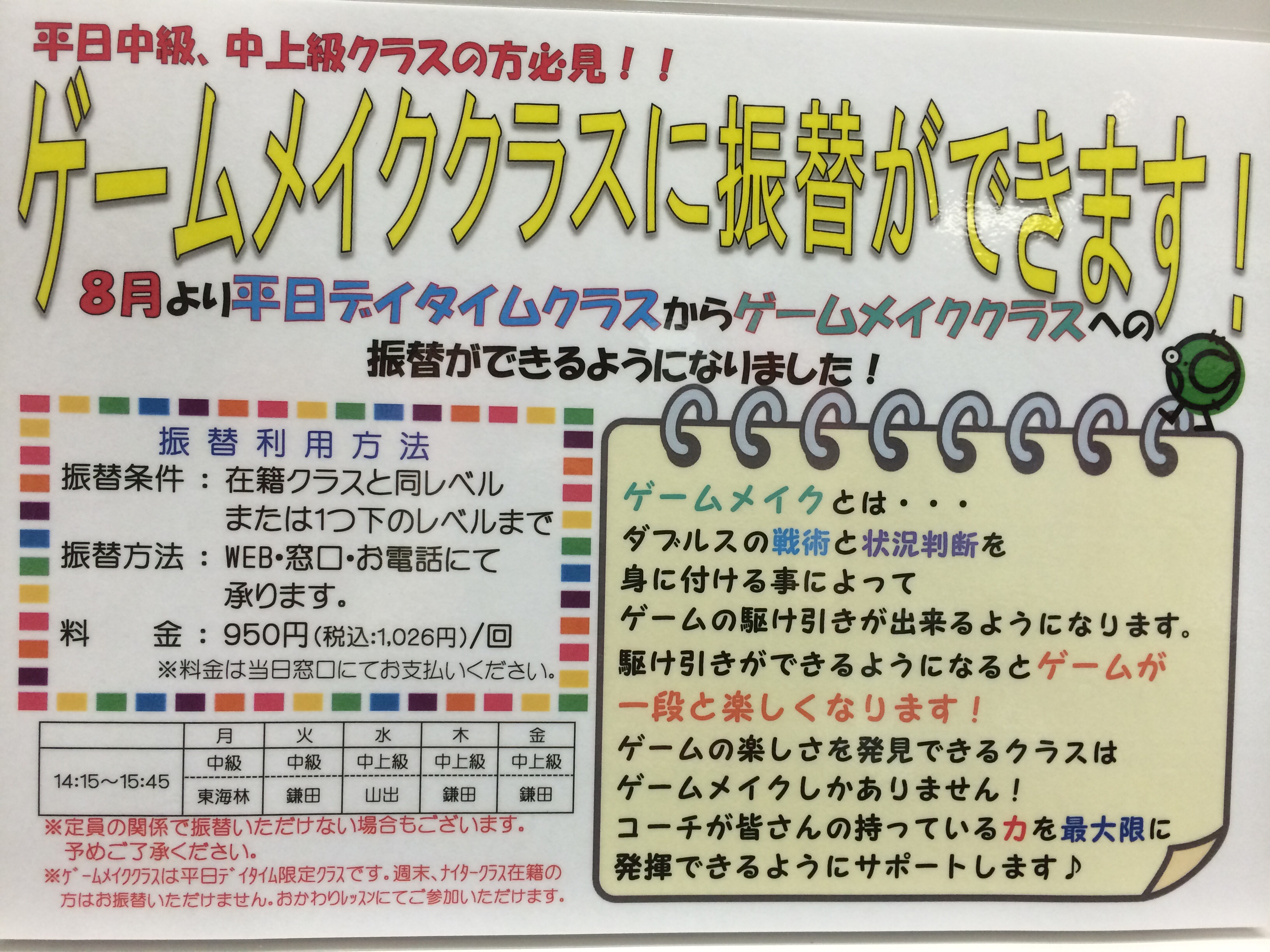 8月より、平日デイタイムクラスからゲームメイククラスへの振替ができるようになりました![]()